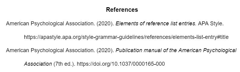 American Psychological Association. (2020). Elements of reference list entries. APA Style. https://apastyle.apa.org/style-grammar-guidelines/references/elements-list-entry#title