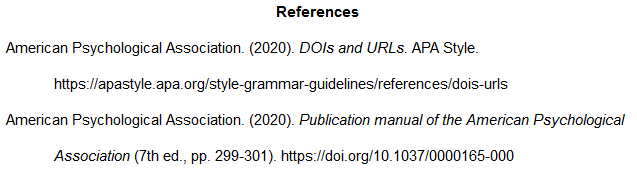 American Psychological Association. (2020). DOIs and URLs. APA Style. https://apastyle.apa.org/style-grammar-guidelines/references/dois-urls